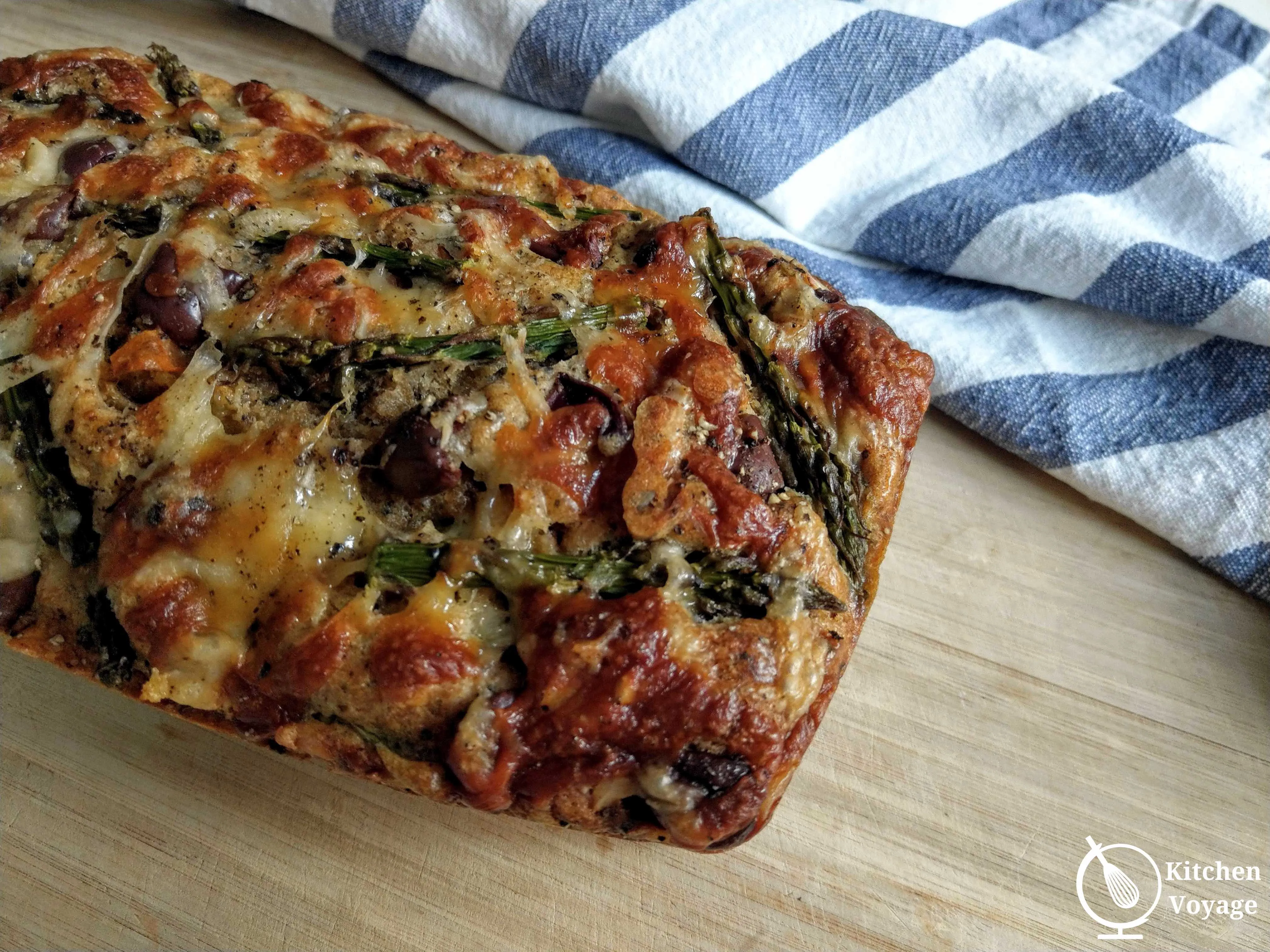 I made this loaf combining fresh asparagus with the mediterranean taste of sun-dried tomatoes and kalamata olives. The dried oregano and thyme leaves complemented the other ingredients while the addition of cheese brought the flavours altogether.