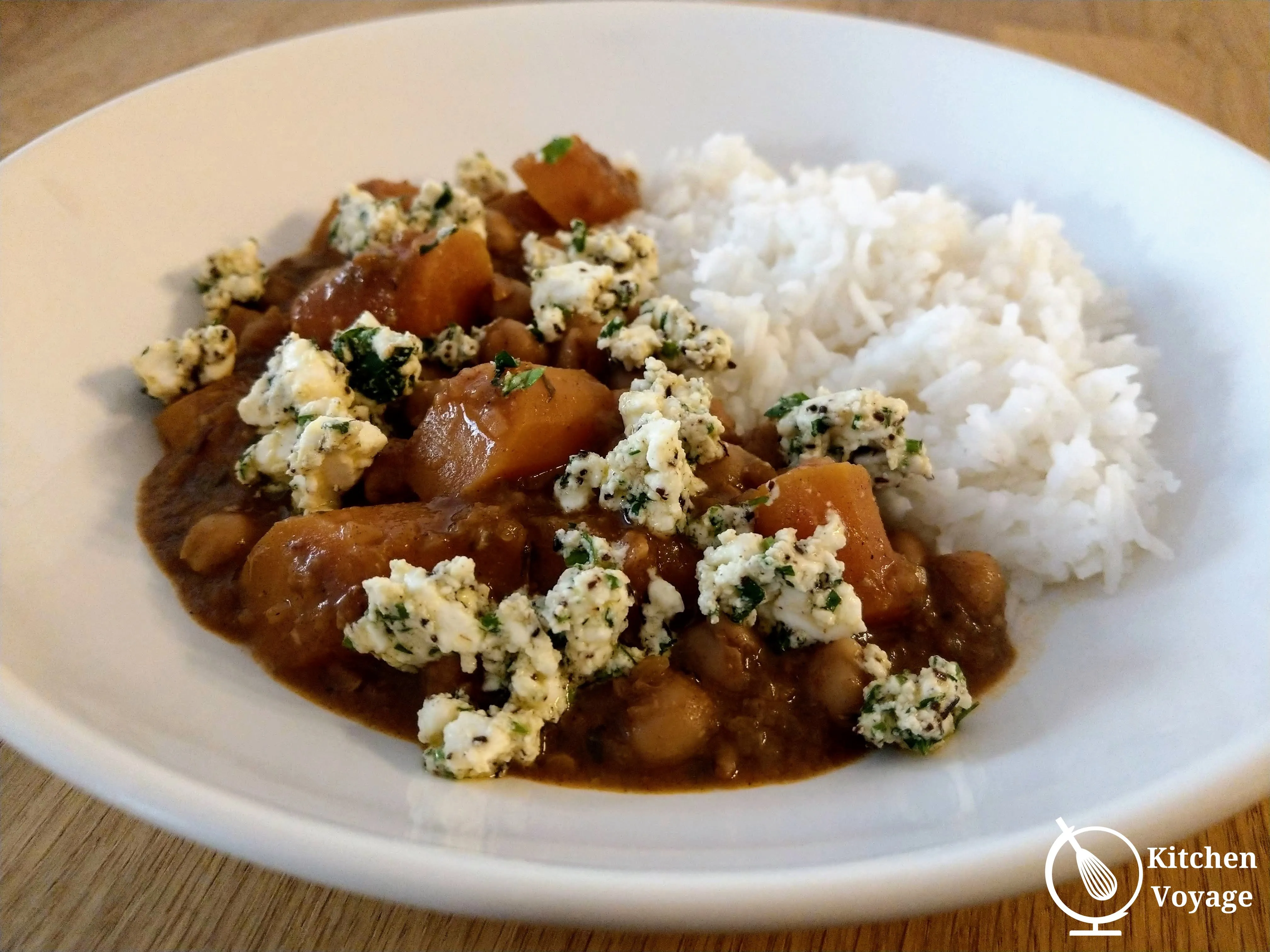 - Serve the carrot and chickpea stew topped with the feta cheese mixture and a side of rice.
