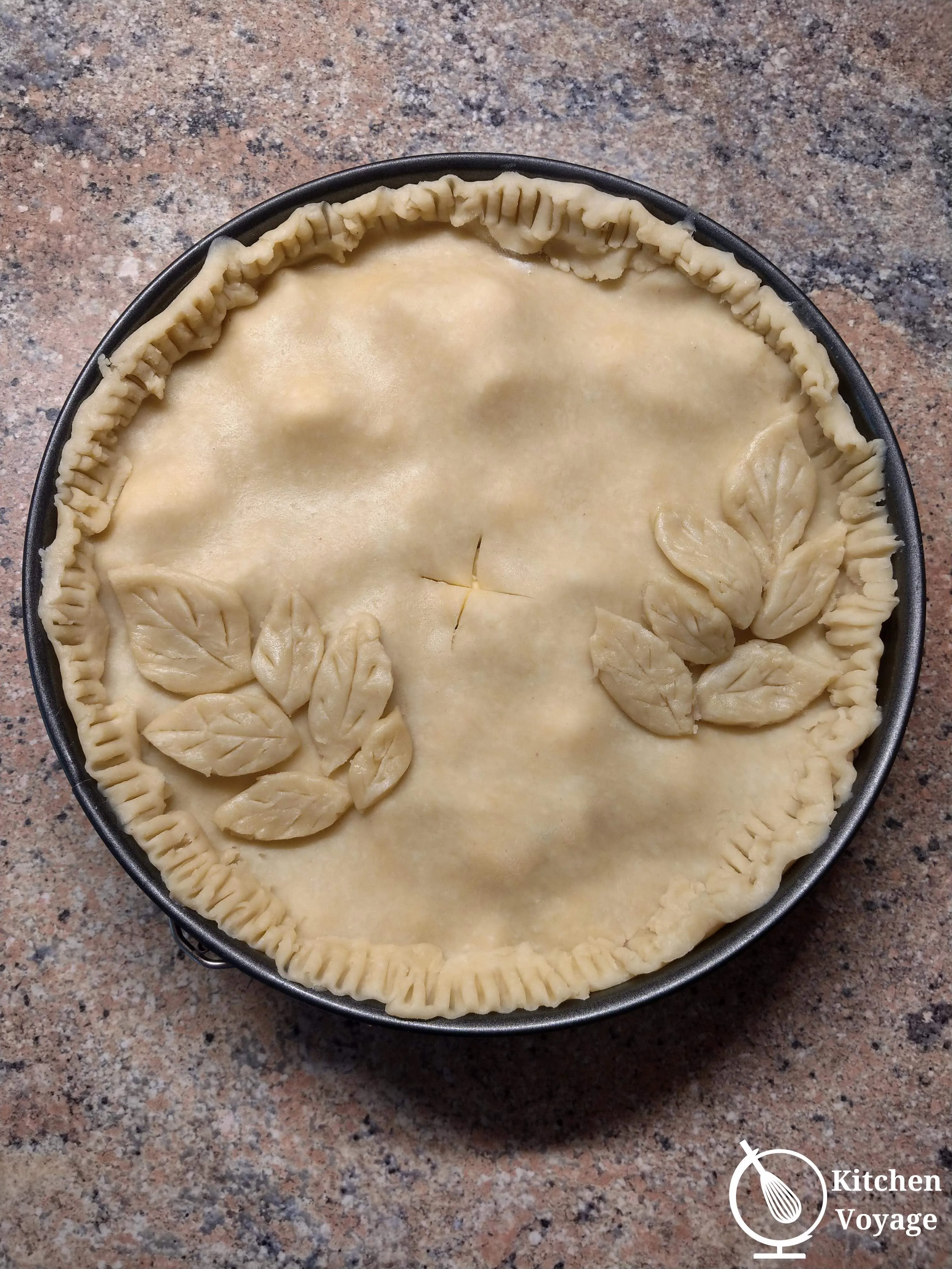 - Roll out the second piece of dough and cover the apple filling. Decorate as desired. Place it back in the refrigerator for another 30 minutes.
