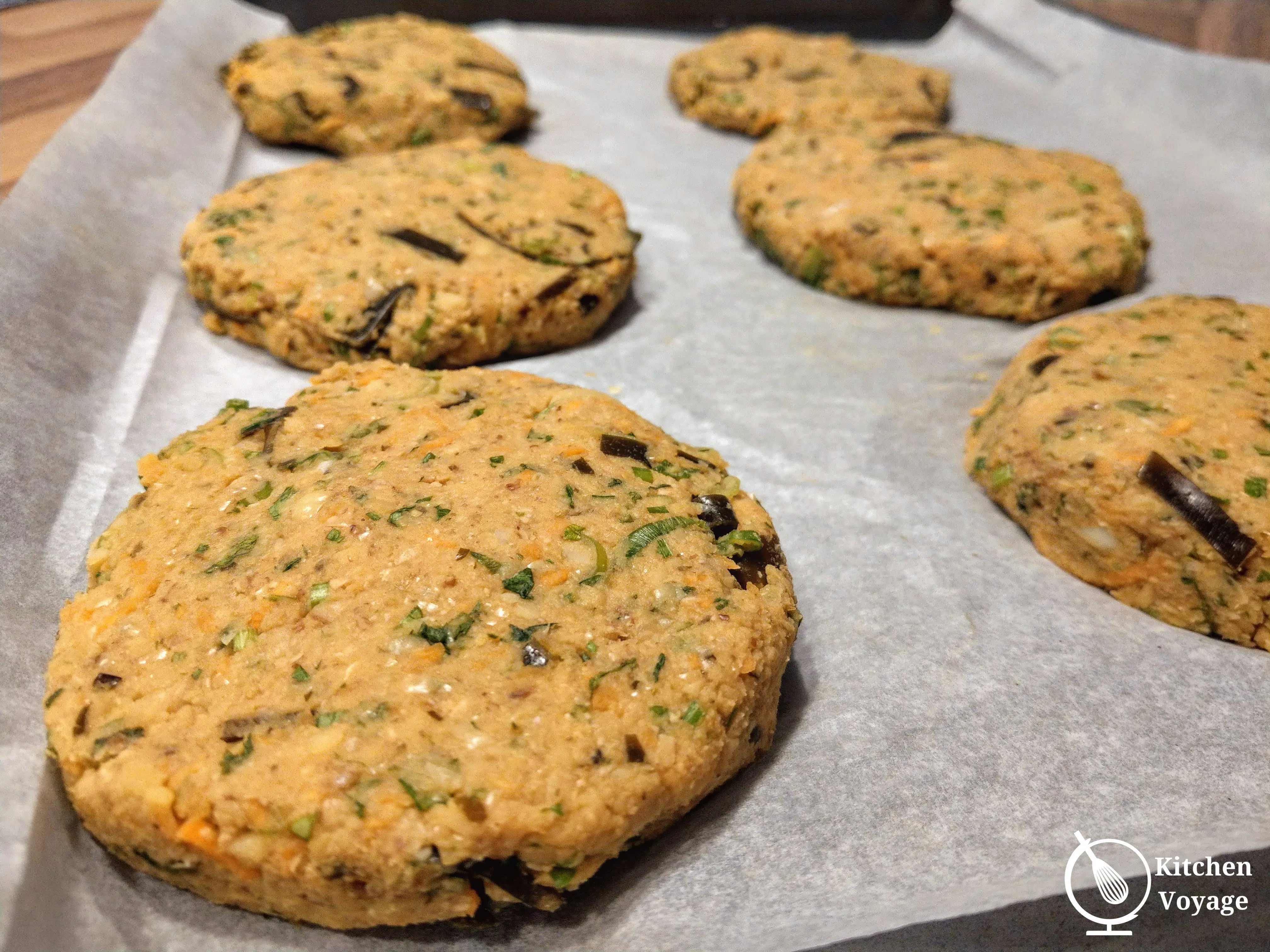 - *For the burgers: *In a food processor, place the cooked chickpeas, and pulse until smooth. Add the carrot, flaxmeal, parsley, coriander. spring onion, miso paste and lemon juice. Pulse until everything is well combined. You might need some of the reserved kombu water to loosen up the mixture. However, make sure that it is not too wet.
